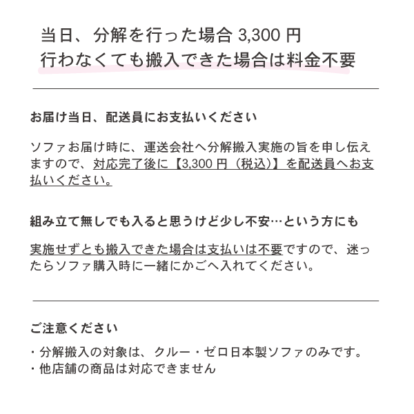 ソファお届け時に、運送会社へ分解搬入実施の旨を申し伝えますので、対応完了後に【3,300円(税込)】を配送員へお支払いください。