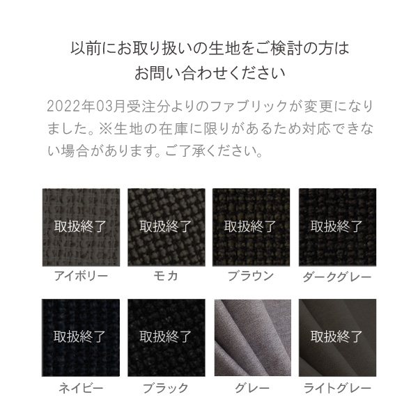 ・生地にはロットにより、多少の色差がございます。お持ちのソファと生産時期が異なる場合には、色差が出る場合がございますので、あらかじめご了承ください。